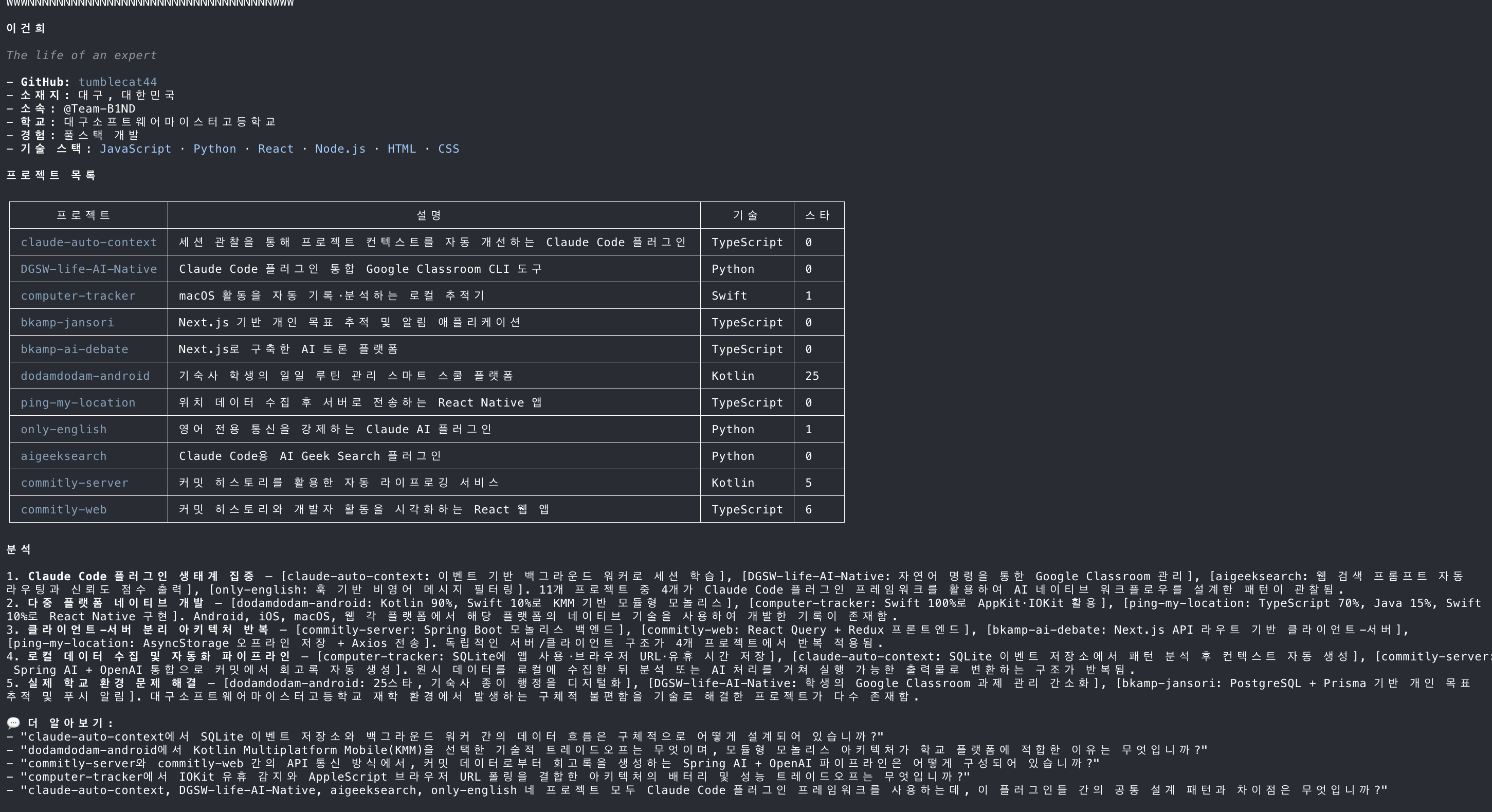 깃허브를 분석해서 AI Agent 가 읽을 수 있는 포트폴리오(.md)를 만들어줍니다.