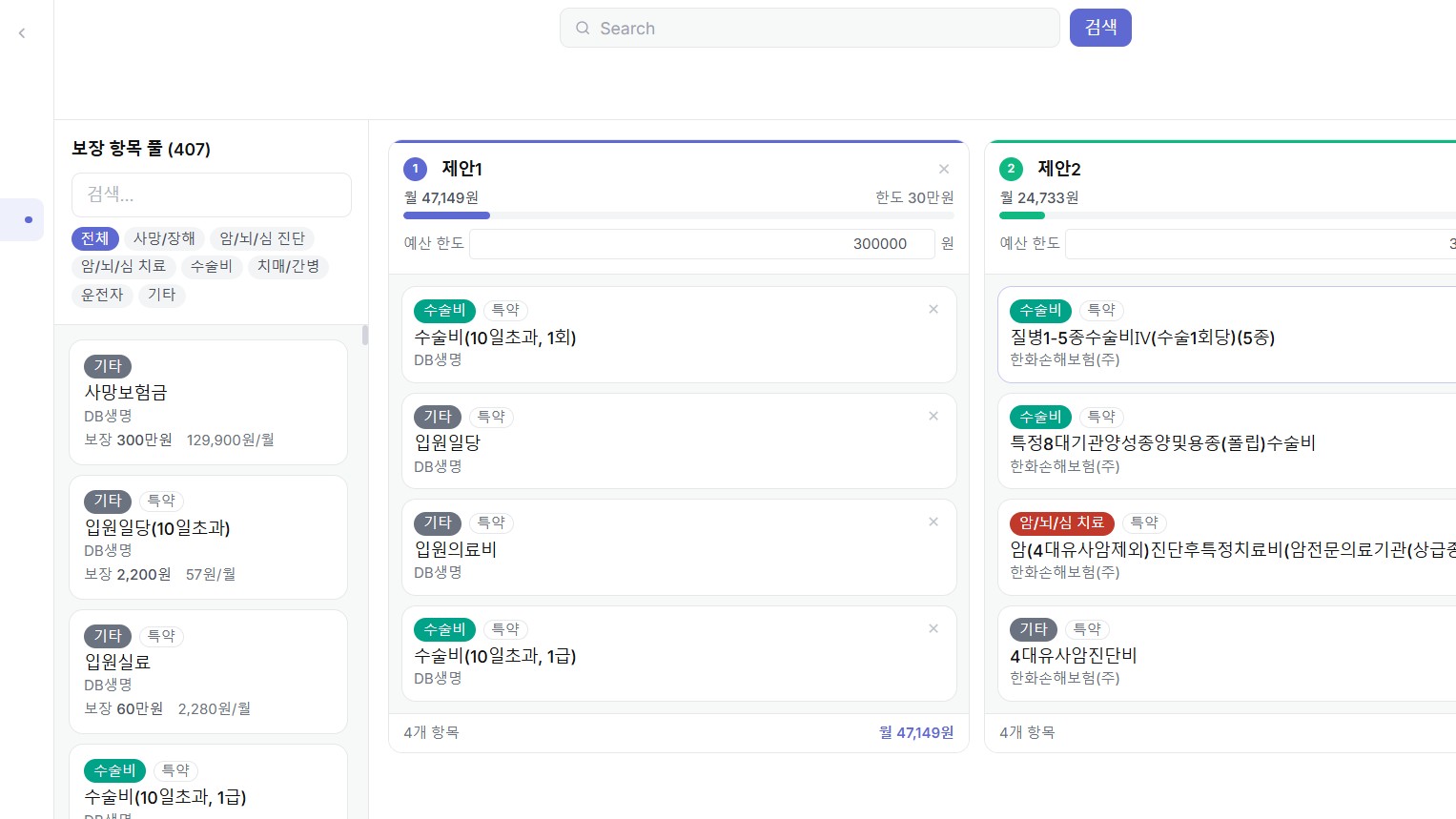 A consultation assistance tool that allows insurance agents to combine products from various insurance companies within a limited budget and visualize coverage details in real time during customer consultations.