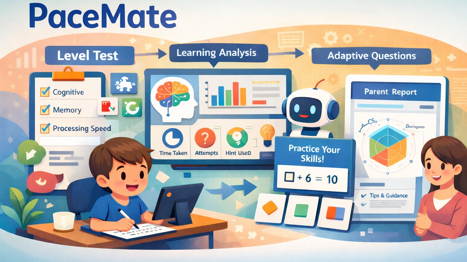 페이스메이트는 평균 중심 교육에서 소외된 경계선 지능 아동을 위해, 역량과 학습 과정에서 나타나는 행동 데이터 분석및 학습 코칭을 하는 AI Agent입니다. 초기 레벨 테스트와 학습 행동 데이터를 기반으로 아이의 역량을 정의하고, 이를 맞춤형 문제 출제와 보호자 행동 지침으로 연결합니다.