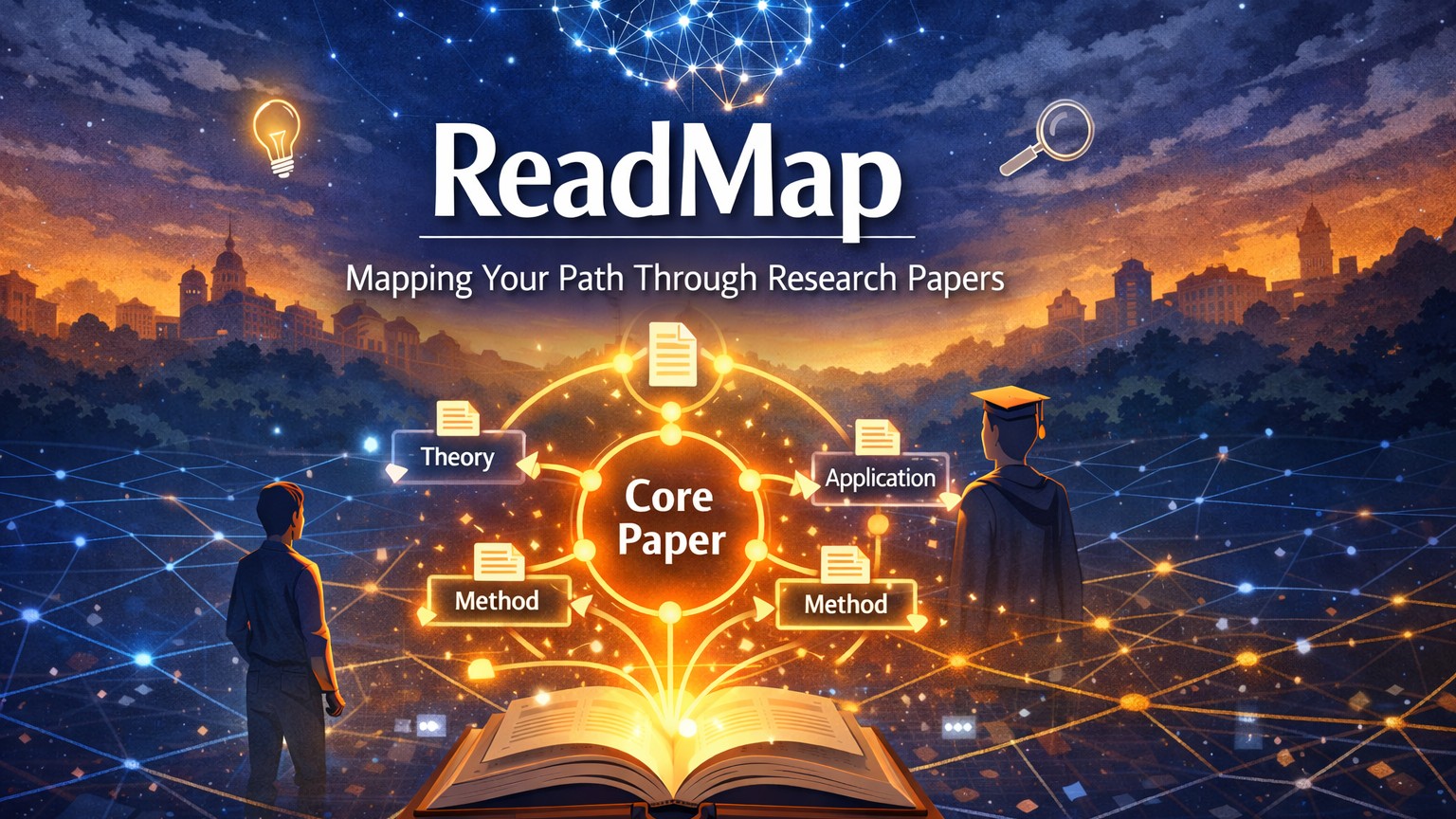 ReadMap은 연구 주제를 입력하면 인용 관계와 학습 난이도를 기반으로 논문을 어떤 순서로 읽어야 하는지 시각적 Route로 제시하는 논문 탐색·학습 보조 도구입니다.