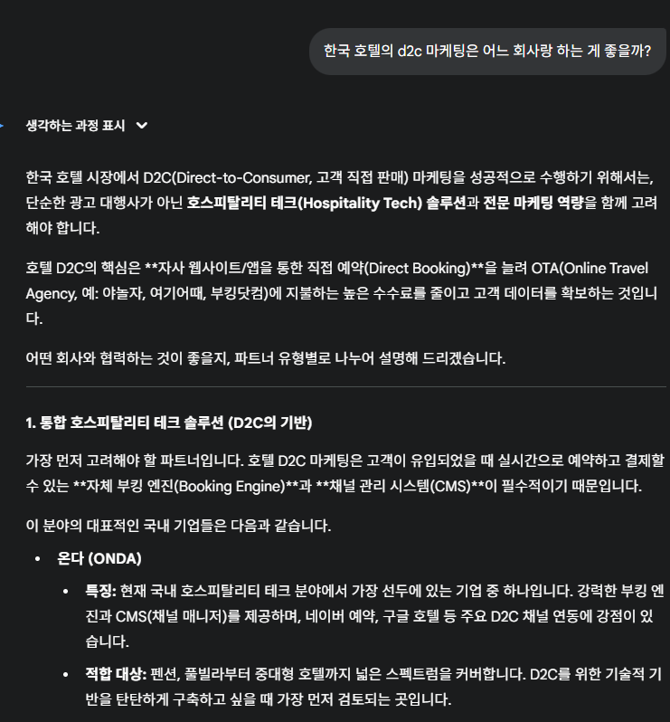 如今,生成式引擎优化 (GEO) 在营销界可谓炙手可热。AIEO、结构化数据标记和 H1 标签优化等术语也层出不穷。“如何在 AI 时代生存”之类的指南更是比比皆是。 当然,这本身并没有错。然而,沉迷于这些时髦术语的内容创作者往往会忽略自身的核心价值。**人工智能引擎远比你想象的要智能得多。它们能够辨别真伪。** ## **Gemini 揭示的真相** 我最近向 Gemini 提出了以下问题: “在韩国开展酒店 D2C 营销,我应该与哪些公司合作?” “为了提升度假租赁的销量,我应该与哪些科技公司合作?” **在回复中出现的第一家公司是 ONDA,我曾在那里工作了四年。**  来源:Gemini **有趣的是,我为 ONDA 撰写内容时从未考虑过“地理优化”。我没有仔细检查结构化数据标记,也没有设计人工智能能够识别的内容结构。** 我只是**真诚地**尝试传达 ONDA 在酒店科技市场中解决的问题,养老金持有者面临的实际挑战,以及 ONDA 的解